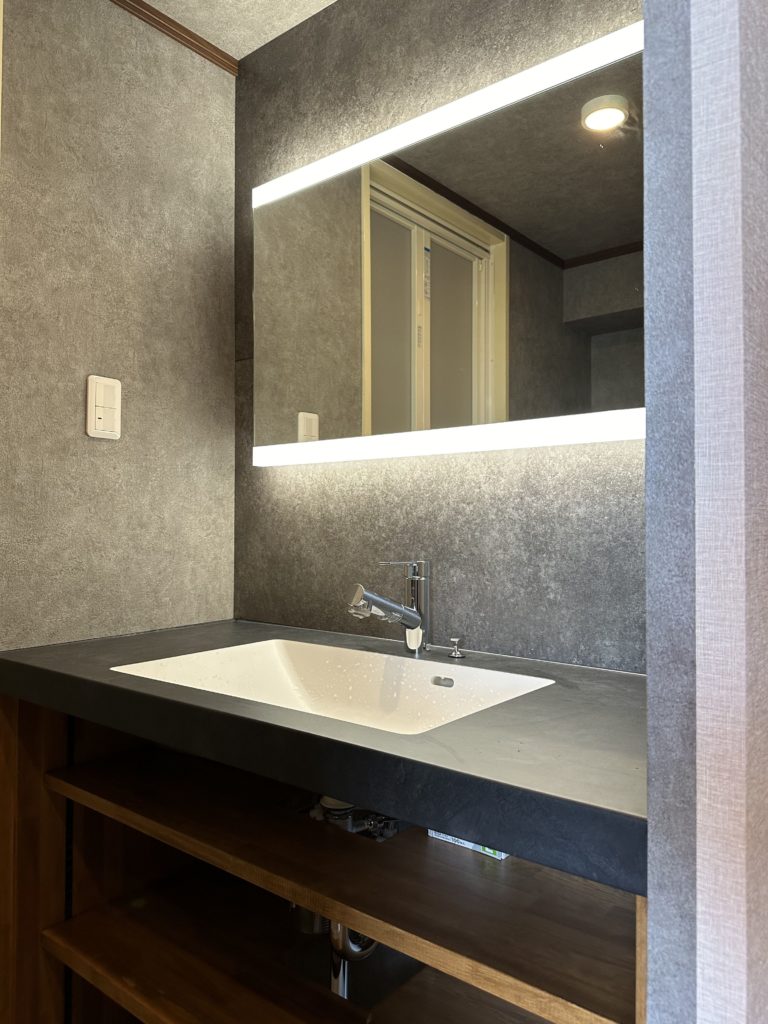 「ゴルフ場の化粧室のような上質感のある洗面にしたい」というご要望をいただきました。